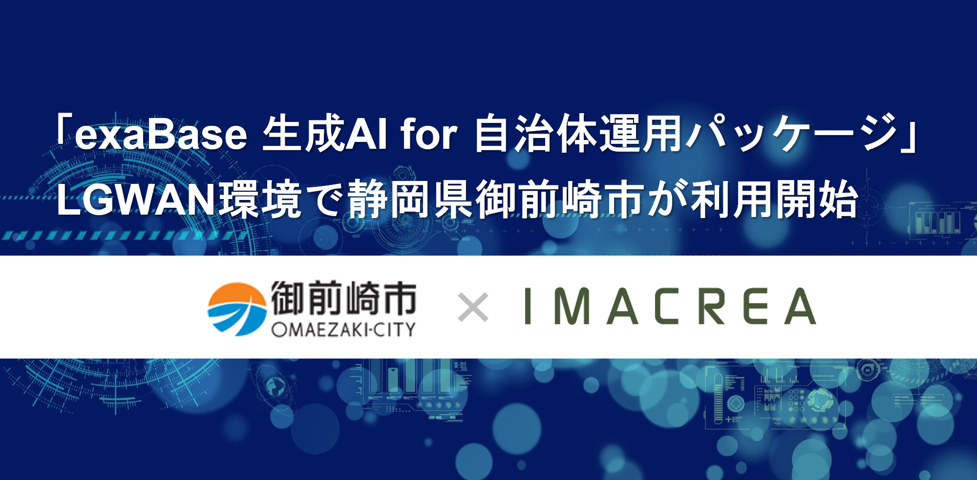 株式会社イマクリエ(本社:東京都港区、代表取締役:鈴⽊信吾、以下、当社)は、静岡県御前崎市において「exaBase 生成AI for 自治体運用パッケージ」(以下、本パッケージ)の提供を開始し、LGWAN環境での運用を正式に開始しました。