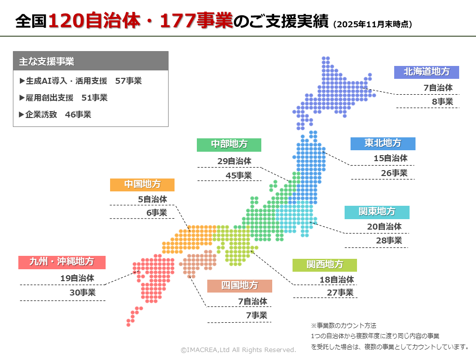 全国50以上の地方自治体に対して汎用生成AIツールを導入し、運用支援を行っています。また、法人向けには、生成AIの活用に関するコンサルティング支援を実施。自治体や企業のDX(デジタルトランスフォーメーション)推進をサポートし、業務効率化やサービス向上に貢献しています。